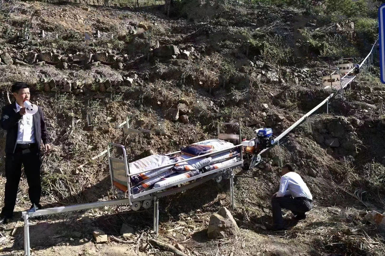 单轨运输车由车头(汽油发动机、变速箱、制动装置)和拖车组成。一组手动制动装置使轨道车随时移动和停止。这位同事还安装了一组紧急制动装置,当轨道车工作异常时,该装置会自动强制停止轨道车。